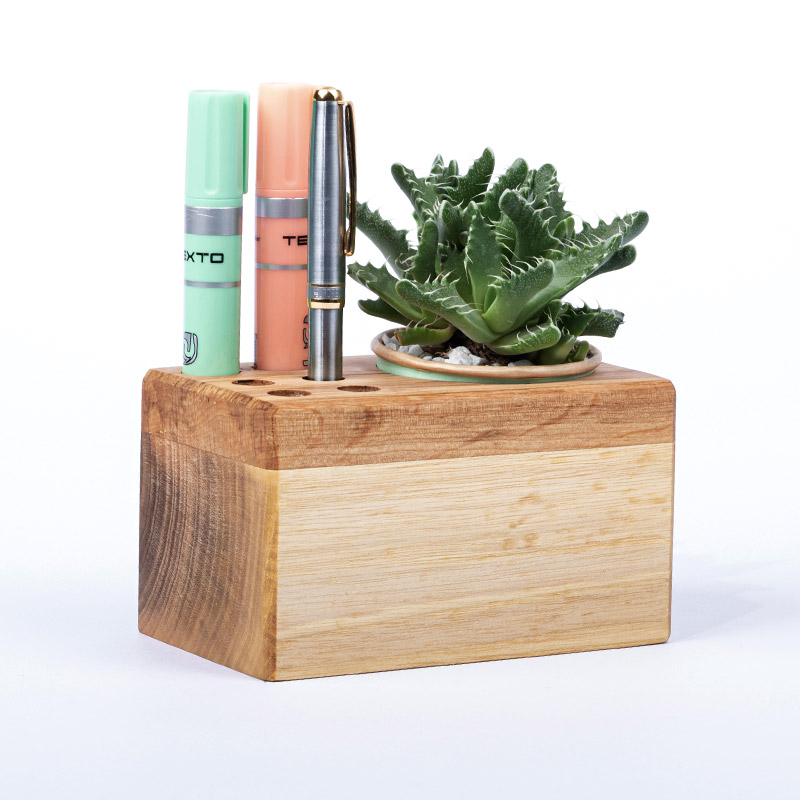 جامدادی چوبی مکعبی  طرح ترکیبیبا لبه های ابزار خورده مورب و نقش زیبای خیره کننده  در طیفی از رنگهای تیره تا روشن ،محصولی زیبا و چشم نواز بر روی میز کار و یا کتابخانه و .. می‌باشد. این محصول با سطحی بسیار صیقلی و پوششی از روغن‌های طبیعی گیاهی اثری زیبا با کاربری مختلف نظیر جامدادی، قلمدان، گلدان، جای قلم مو و سایر لوازم به انتخاب مشتری خواهد بود.