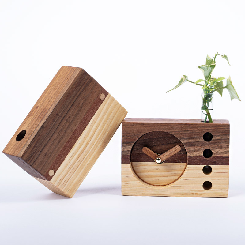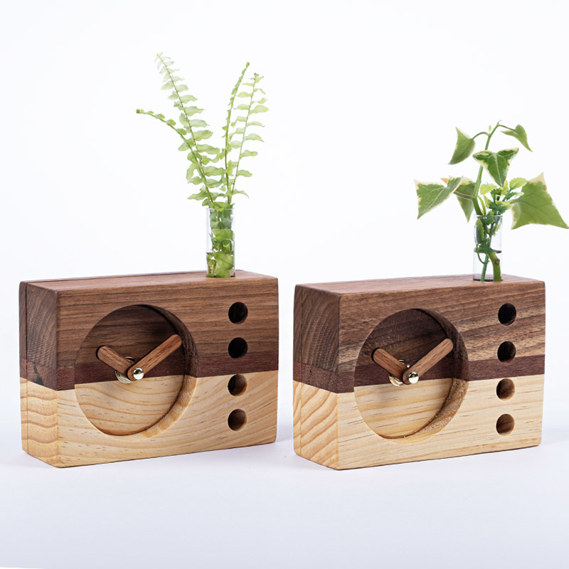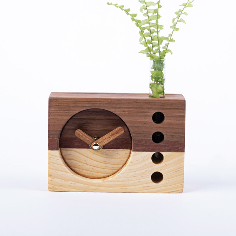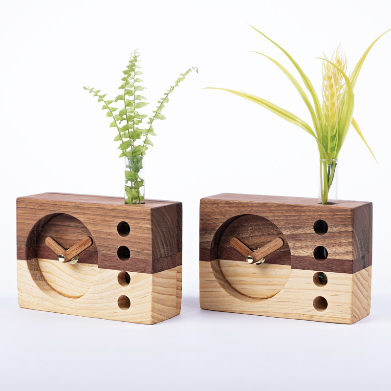 ساعت چوبی رومیزی ترکیبی با ساعتی آرامگرد با امکان قرار دادن یک لوله آزمایش برای قراردادن یک گل و استفاده از چوبهایی با رنگ متفاوت با نقوش بسیار زیبا و سطحی بسیار صیقلی با القای حسی لذتبخش یک محصول چوبی زیبا و دکوری مناسب برای استفاده بر روی انواع  قفسه های دکوری و کتابخانه، میز تحریر یا هر فضای دلخواه دیگر بوده که با کیفیتی بالا و سطحی صیقلی تولید شده و زیبایی بخش محیط زندگی شما می‌باشد.
